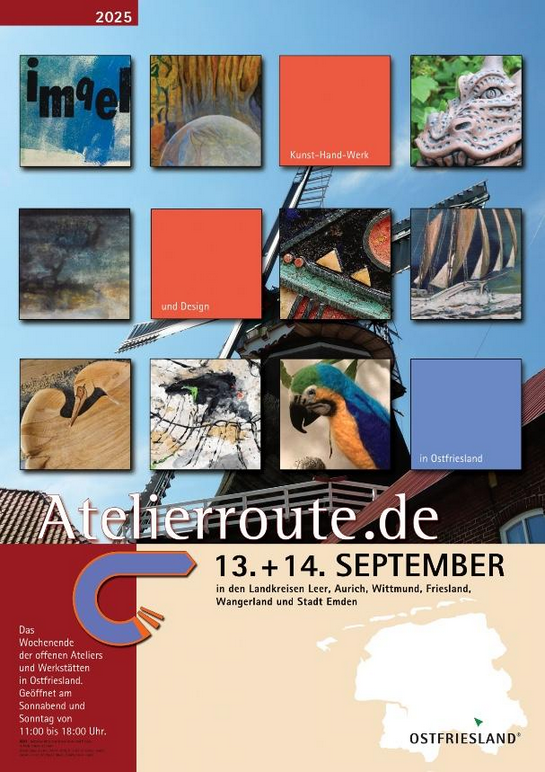 Die Initiative für Kunst-Hand-Werk und Design in Ostfriesland vereint Künstler und Kunsthandwerker zur ATELIERROUTE, einem Wochenende der offenen Ateliers und Werkstätten in Ostfriesland.